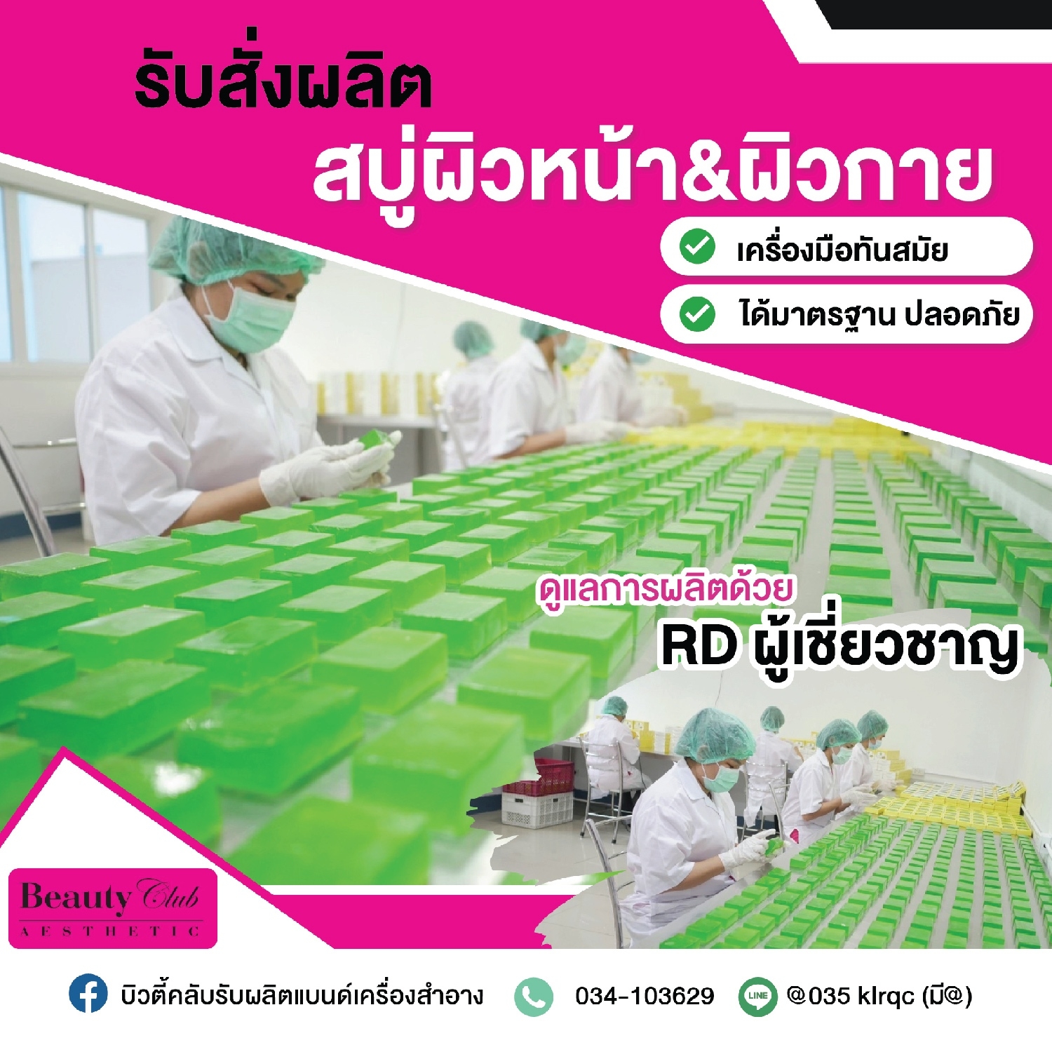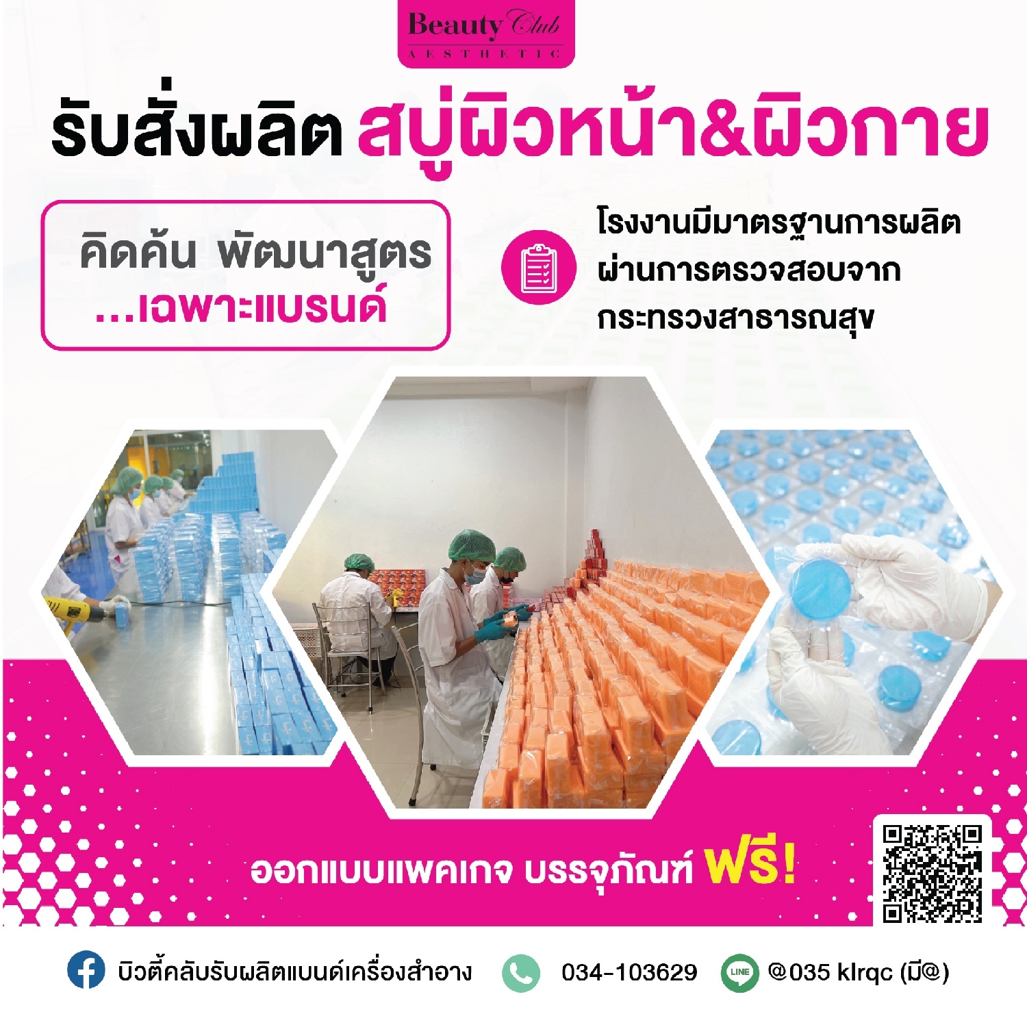 บริษัท บิวตี้ คลับ เอสเธติค จำกัด เป็นหนึ่งในผู้นำอุตสาหกรรมการผลิตเครื่องสำอางค์ยุคใหม่ สามารถควบคุมคุณภาพให้ได้มาตรฐานในทุกขั้นตอน เรามีความเชี่ยวชาญ และมีทีมงานผู้ควบคุมการผลิต และวิจัยผลิตภัณฑ์ ผลิตสินค้าตามมาตรฐาน โดยทีมนักวิทยาศาสตร์เครื่องสำอางค์มืออาชีพที่มากด้วยประสบการณ์ยาวนานกว่า 10 ปี รับผลิตเครื่องสำอางทุกชนิดแบบ One-Stop Service พร้อมบริการขึ้นทะเบียนเครื่องสำอางค์ ควบคุมภายใต้คณะกรรมการอาหารและยา(อย.) เรามีโรงงานผลิตสินค้าด้วยเทคโนโลยี และเครื่องจักรอันทันสมัย เพื่อผลิตเครื่องสำอางค์ออกสู่ตลาดทั้งภายในและต่างประเทศ